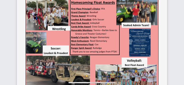 Well it did actually Rain on our Parade but that in no way dampened our Spirits. In fact the Lady Rangers won the Loudest Float and Most Spirited Groups Award. Well Done Lady Rangers! And a special thank you to Lisa Alvord for helping to secure a Trailer, to Mr. Ryan Gray for driving the float, and to Phil and Kim Ganoe for providing our Rocking Sound System. HOCO Week was a great success.